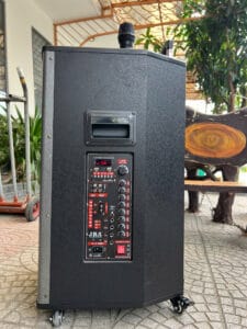 Mặt lưới kim loại phủ sơn đen chống gỉ giúp bảo vệ linh kiện bên trong, đồng thời tạo vẻ ngoài mạnh mẽ và hiện đại. Tay cầm hai bên cùng bánh xe chịu lực giúp di chuyển loa dễ dàng, đặc biệt phù hợp cho người thường xuyên tổ chức tiệc hoặc sự kiện lưu động.
