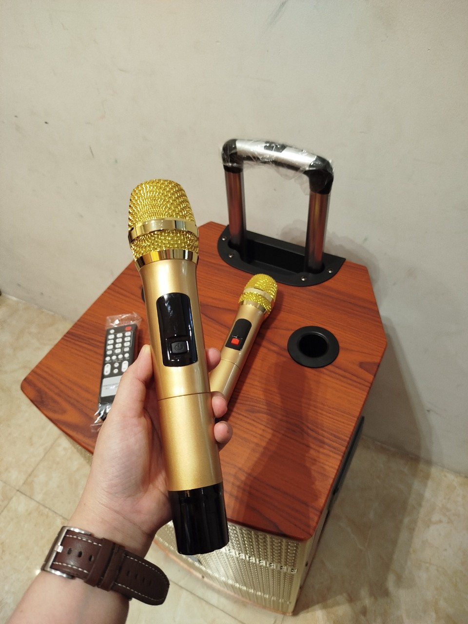 - Micro Hút Âm Chống Hú Rít: Đi kèm loa là cặp micro không dây UHF cao cấp có khả năng hút âm cực tốt, giúp người hát cảm thấy nhẹ nhàng, không tốn hơi. Đặc biệt, công nghệ xử lý tín hiệu số (DSP) tích hợp giúp hạn chế tối đa tình trạng hú rít khó chịu, đồng thời giữ kết nối sóng ổn định trong phạm vi rộng.