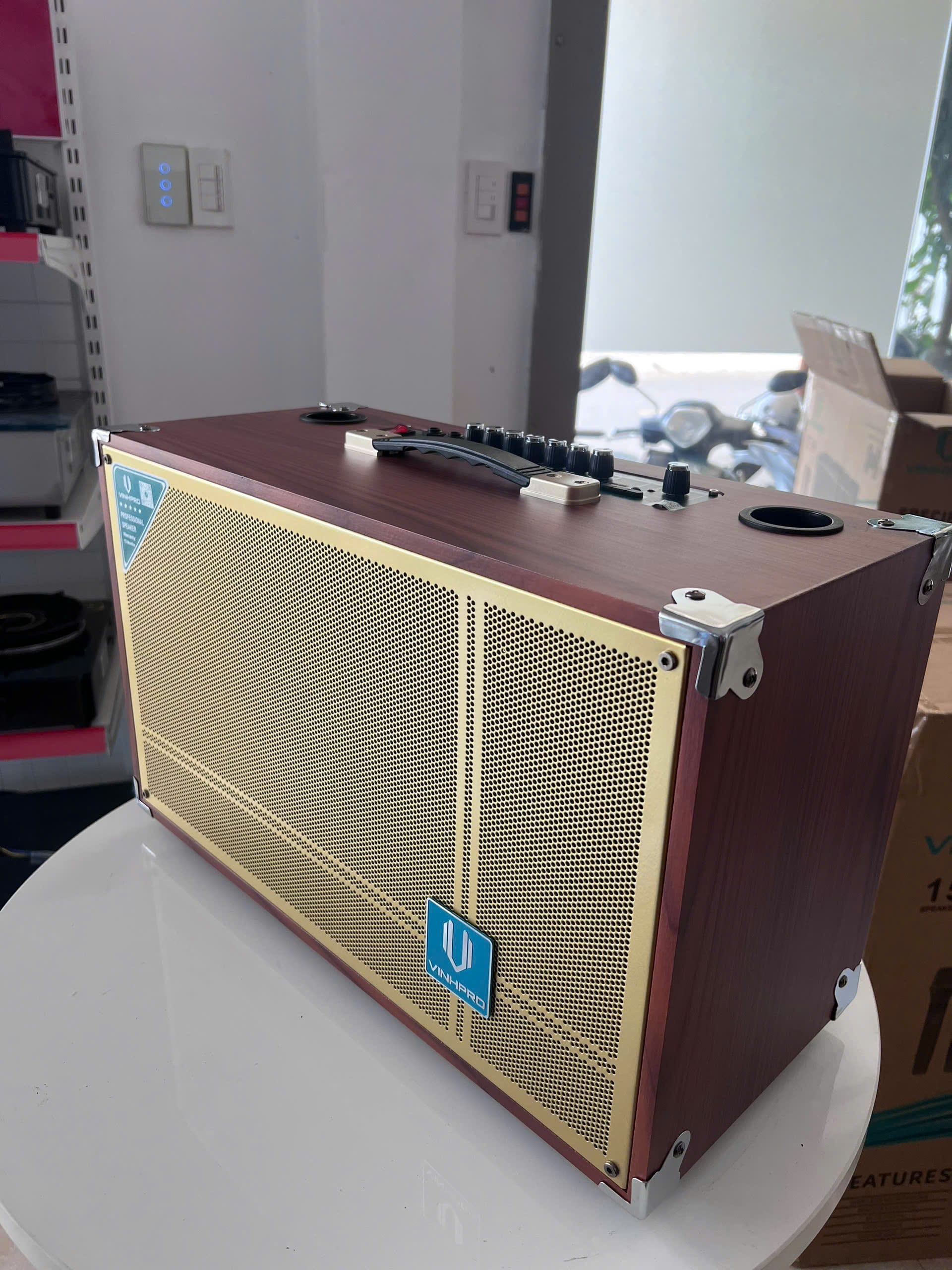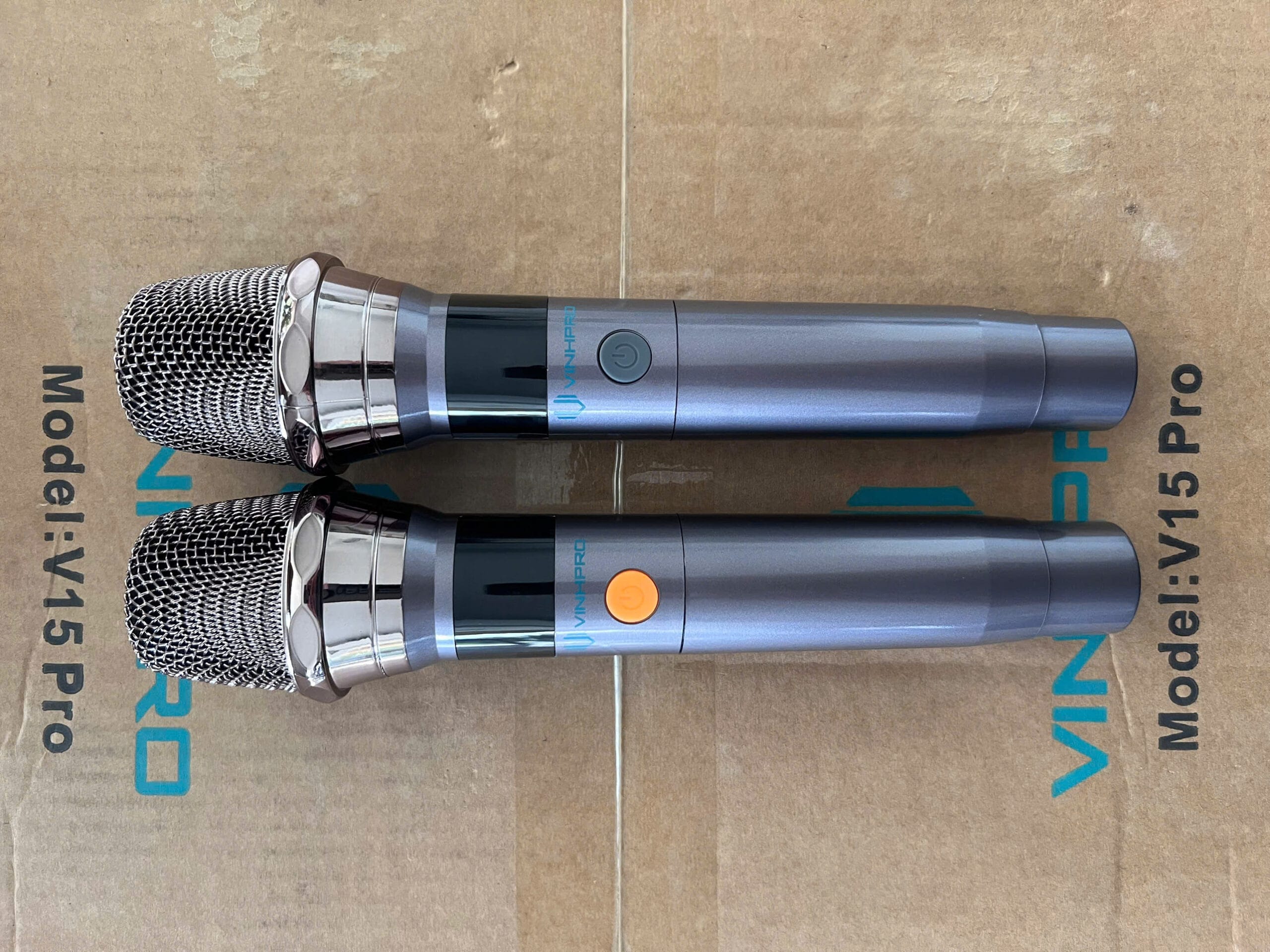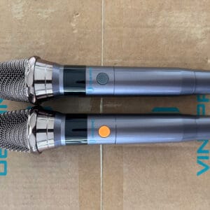 - Cặp Micro UHF Siêu Nhạy: Đi kèm là hai tay micro không dây vỏ kim loại sang trọng, sử dụng sóng UHF cho tín hiệu ổn định, khả năng hút âm tốt và tái tạo giọng ca trung thực.