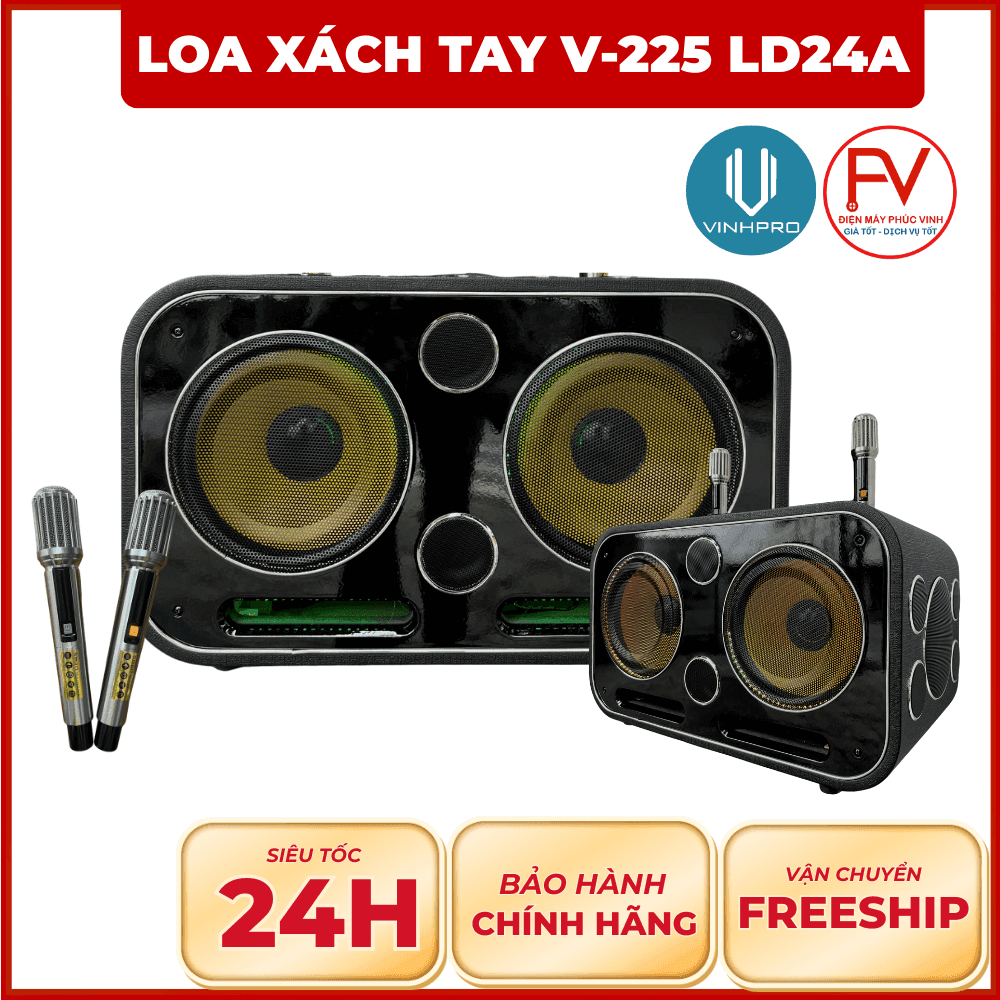 Loa xách tay V-225 LD24A là loa karaoke di động, bass đôi mạnh mẽ và pin dung lượng cao.