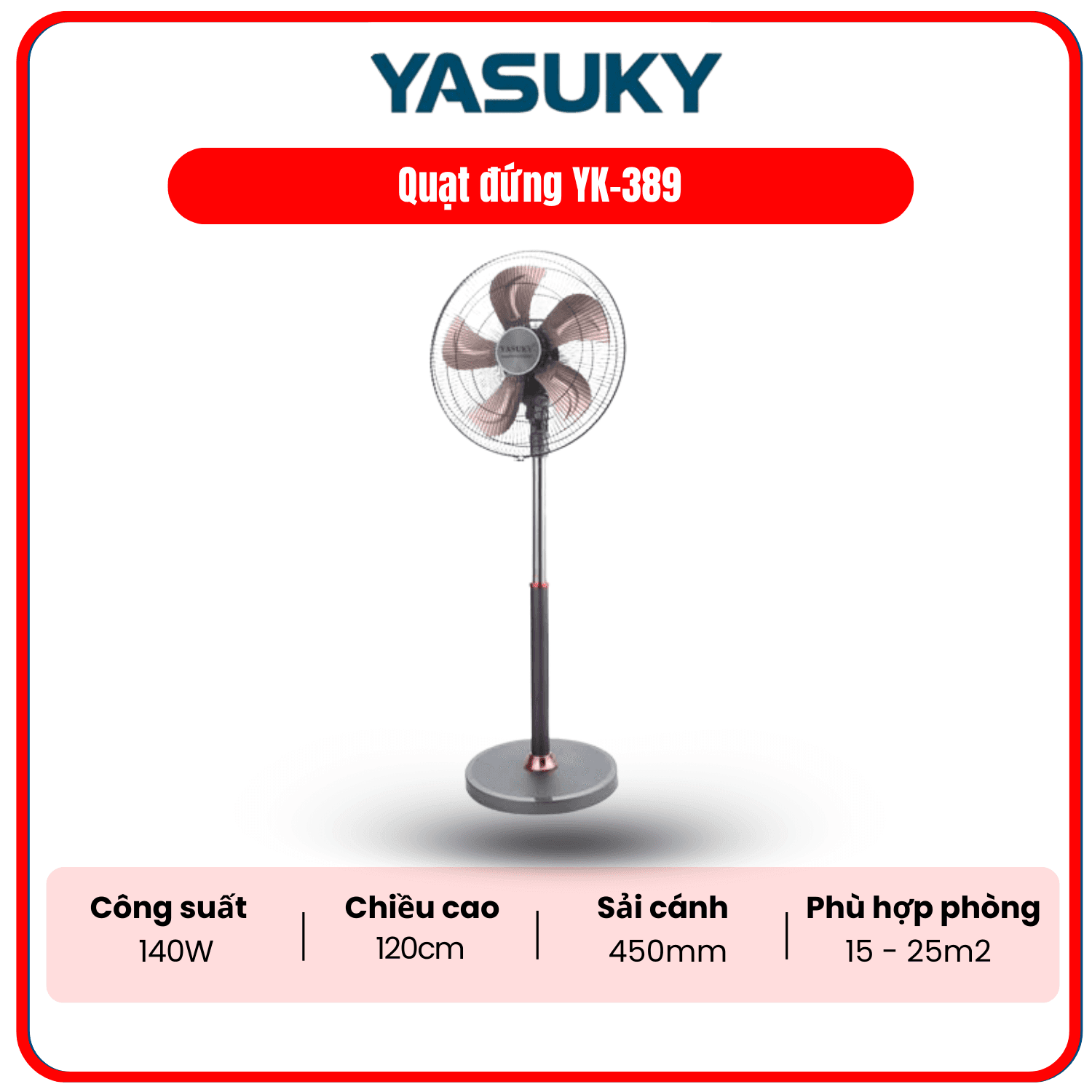 Quạt đứng YASUKY YK-389 là mẫu quạt đứng cao cấp, nổi bật với công suất cực lớn 140W, mang đến luồng gió mạnh vượt trội, phù hợp cho không gian cần làm mát nhanh như phòng khách lớn, cửa hàng, văn phòng, showroom. Kết hợp motor đồng nguyên chất và sải cánh lớn 450mm, quạt đảm bảo hiệu suất cao và độ bền lâu dài.