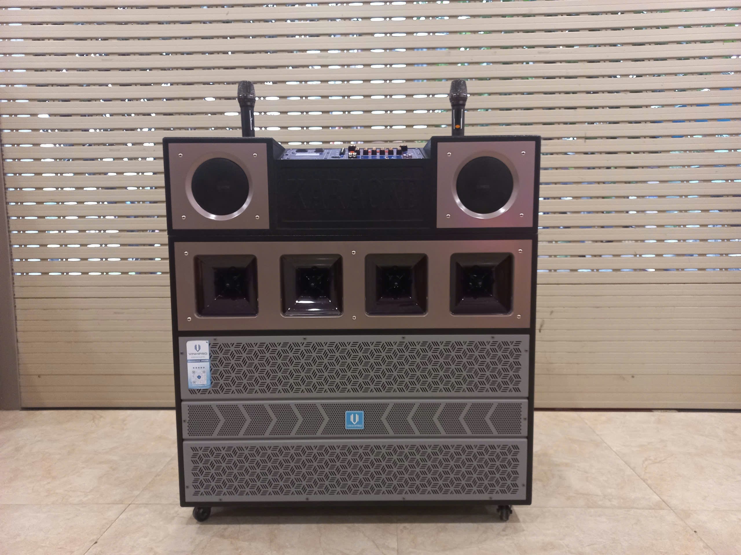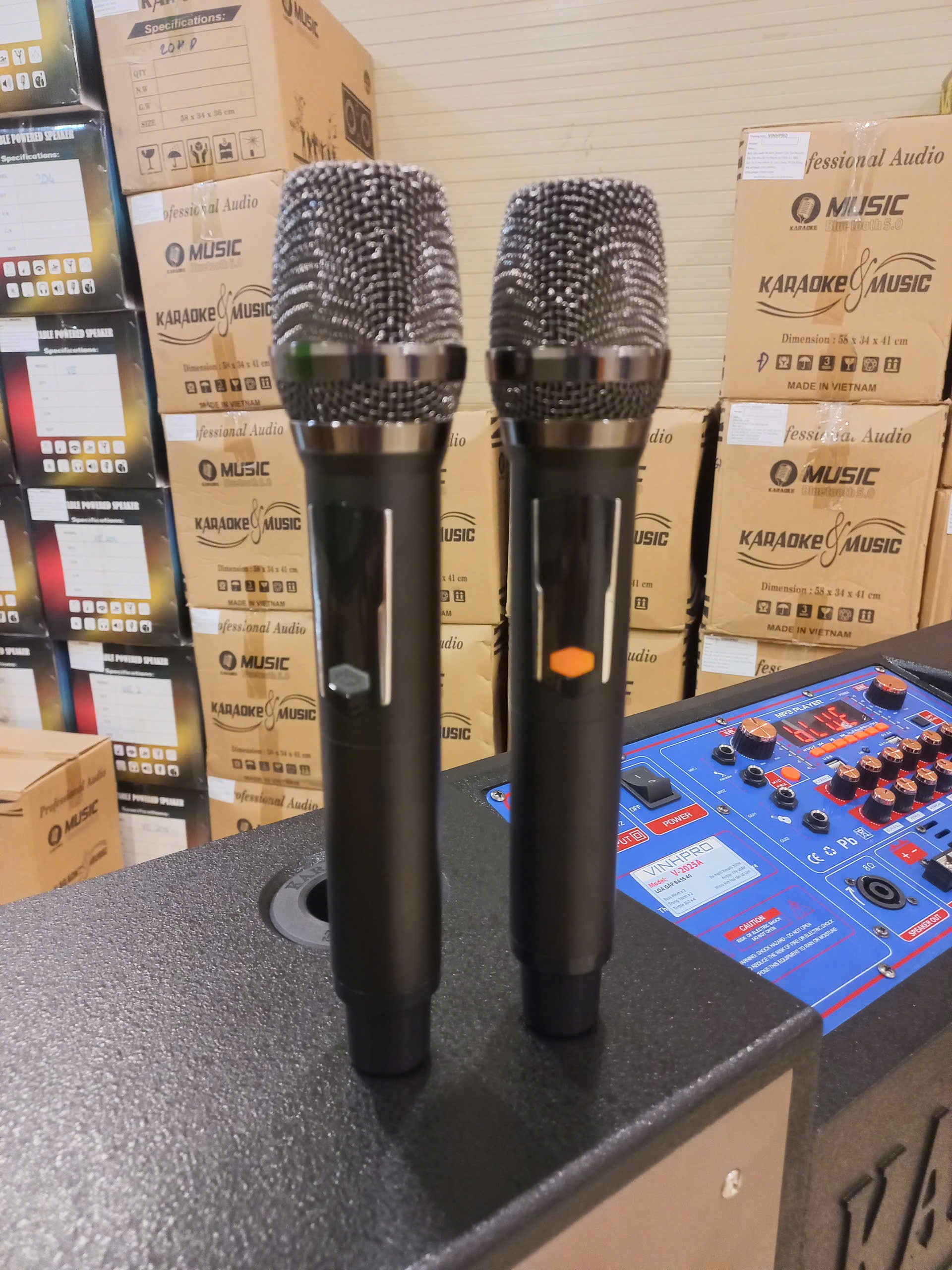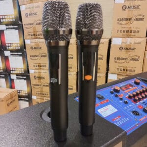 - Cặp Micro UHF Siêu Nhạy: Đi kèm loa là 2 tay micro không dây sóng UHF cao cấp, có khả năng tự động dò và set tần số sạch để tránh trùng sóng. Micro có độ nhạy cao, bắt âm tốt, giúp bạn hát nhẹ hơn, lên cao không bị hụt hơi.